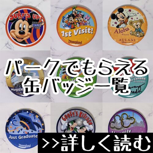 海外ディズニーでもらえる限定の缶バッチを集める方法について。もらえる場所と、種類についても記載しています。